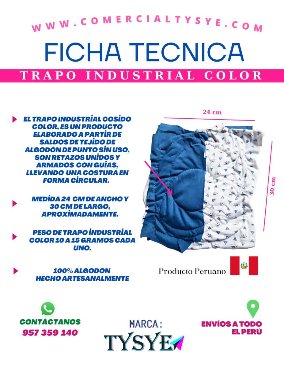 El Trapo Industrial Cosido Color, es un producto Elaborado a partir de saldos de tejido de algodón de punto sin uso, son retazos unidos por una costura en forma circular, medida 24 por 30 cm, aproximadamente.100 % algodón y hecho artesanalmente.